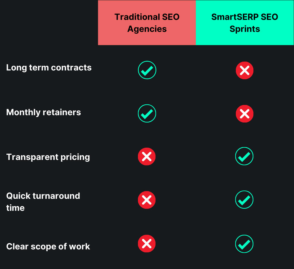Our SmartSERP methodology compresses the work done in a traditional SEO campaign into impactful, transparently priced sprints so you can fly up the rankings, drive more traffic, and see a positive ROI faster than ever before.Proudly brought to you by
